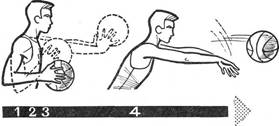 б) то же, но, прежде чем выпустить мяч, игрок поворачивает туловище к цели, а замах выполняет прямой рукой вниз-назад-вверх. На рис. 8 показан бросок крюком с поворотом.