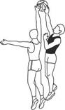 Овладение мячом в борьбе за отскок у своего щита. После броска нападающего защитник должен преградить сопернику путь к щиту, занять устойчивое положение, затем бороться за отскок, быстро и своевременно выпрыгивая для овладения мячом. Прыжок выполняется как одной, так и двумя ногами после небольшого разбега или с места. Высоко выпрыгнув и завладев мячом, игрок при приземлении широко разводит ноги и сгибает туловище, чтобы в силовой борьбе помешать сопернику занять выгодное положение по отношению к щиту и мячу (рис. 22).