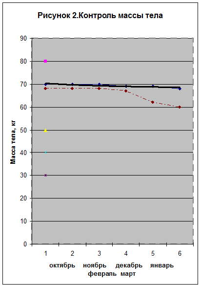 График в отношении контроля массы тела [рис 2] был построен на основании ежемесячных измерений веса наблюдаемых спортсменок и его динамики в обеих группах. На основании полученных данных можно судить о том, что в контрольной группе с учётом специфики тренировки по восточным танцам, направленной на развитие гибкости, грации, овладения специальными движениями масса тела осталась практически на том же уровне, что и в начале исследования.