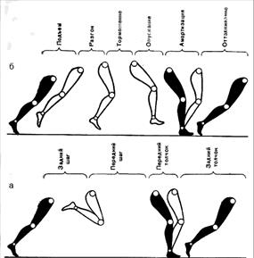 Рис.3.2. Фазы шагательных движений в беге: а) по кинематическим данным (позам); б) по динамическим данным (усилиям)