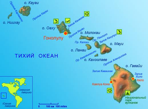 | О-в. Оаху | Купально-пляжный. | Северный берег –известный рай для серфенгистов, пляжи Hanauma Bay Beach, Lanikai Beach, Kailua Beach Park, военно-морская база Перл-Харбор. |