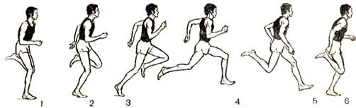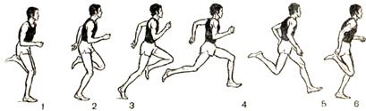 Бегун, придя в положение для отталкивания, энергично выносит маховую ногу вперед-вверх (рис. 1.2-3). Бедро маховой ноги проделало значительный путь в своем ускоренном подъеме. Толчковая нога быстро выпрямляется, когда бедро маховой ноги поднято достаточно высоко. Отталкивание завершается не только полным выпрямлением опорной Ноги, но и разгибанием в голеностопном суставе (рис 1.3) (подошвенное сгибание).
