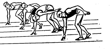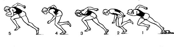 По команде "Марш"! бегун, отрывая руки от дорожки, отталкивается от колодок. Нога, стоящая сзади, отрывается от колодки первой и энергично выносится бедром вперед и несколько внутрь. Стопа держится невысоко от земли, что позволяет сократить ее путь от колодки до места постановки за стартовой линией (рис 2).