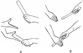 Мяч берется в правую (левую) руку так, чтобы он не соприкасался с ладонью и лежал на указательном и среднем пальцах, придерживался с боков безымянным и большим пальцами (рис. 1).