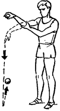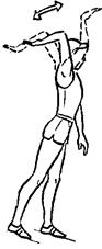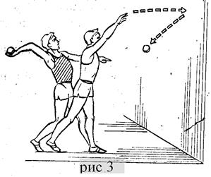 Имитируется бросок последовательным и непрерывным выпрямлением руки вперед-вверх; затем рука продолжает движение вниз, в строну, назад и до исходного положения. Подготовка к броску имитируется в упражнении без перерыва 8 – 10 раз (рис 2).