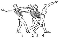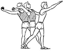2. от его возможностей трансформировать эту скорость, т.е. передать её от нижних к верхним звеньям тела, путем овладения рациональным ритмом последних бросковых шагов. Обгона нижними звеньями тела снаряда и увеличения пути сопровождения снаряда для более продолжительного воздействия на него;