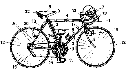 Рама (рулевая труба - 1, наклонная труба - 2, подседельная труба рамы - 3, горизонтальная труба рамы - 4, задняя вилка - 5, передняя вилка – 6, руль (вынос руля - 7), седло (каркас седла, обтянутый кожей - 8, подседельный штырь - 9), ведущий механизм (каретка с двумя педалями, шатуны и большая зубчатка - 10), педали (педали с туклипсами - 11), колеса (втулка, обода, спицы, ниппели, шины (трубки), шестерни - 12), тормоза (тормоза для переднего и заднего колес с гибкой передачей и тормозными ручками - 13), различные части (цепь - 14, задний переключатель передач - 15, передний переключатель передач - 16, монетка переднего и заднего переключателей передач - 17, насос и устройство его крепления - 18, генератор с лампой - 19, стоп-сигнал - 20, звонок - 21, запасная шина - 22).