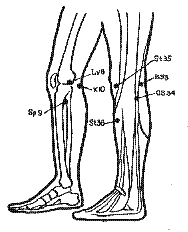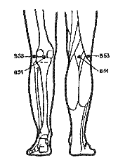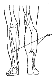 1. Точка В 57 («поддерживающая гору»). Симметричная точка, находится в центральной части основания икроножной мышцы, в середине линии, соединяющей пятку и коленный сустав (рис.). Массаж этой точки помогает снять судороги икроножной мышцы, боль в колене и отеки, воздействие на точку применяется при лечении люмбаго.