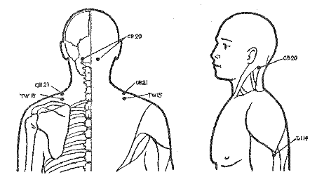 1. Точка TW 15 («божественное омоложение»). Симметричная точка, расположена примерно на 1 палец вниз от верхнего края плеч, в центре линии, идущей от бокового края плеча к основанию шеи (рис.). Применяется при болях и напряжении плеч и шеи.