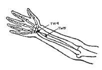 4. Точка TW 4 («бурный водоем»). Симметричная точка, расположена на внешней стороне сгиба кисти, в центральной точке сгиба, в углублении (рис.). Снимает боли в лучезапястном суставе, укрепляет ткани, помогает при лечении ревматизма и тендовагинита.