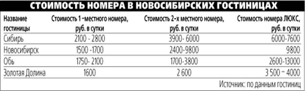 Большинство гостей стремятся поселиться в наиболее комфортабельных гостиницах. Особенно остро ощущается спрос на номера ценой около $150 в сутки, говорит менеджер фирмы «Интернет-плюс» (бронирует отели в регионах). А в целом уровень цен на гостиничные услуги в Новосибирске она оценивает на 10-15% выше, чем в других городах миллионниках, не включая Москву и Санкт-Петербург.