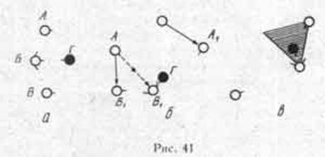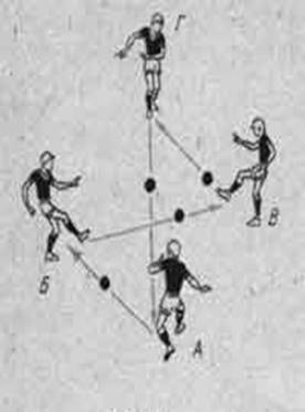 1. На полі позначається майданчик 10Х10 кроків. Троє гравців нападу грають проти одного захисника. Хід гри пояснюється на мал. 1. Нападаючий Б займає позицію з м'ячем між партнерами А и В, показуючи руками, де вони повинні зайняти місця (а). Потім гравець Б передає м'яч гравцеві В и спрямовується убік передачі, пропонуючи себе для зворотної передачі. Гравець А також виходить на вільне місце, але тільки в іншу сторону. Гравець У с м'ячем, розставивши руки, указує партнерам нові позиції (б). Завдання гравця Г-Атакувати нападаючого, що володіє м'ячем, і примусити його виконати передачу в певну сторону (в).