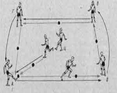 Чотири гравці утворюю прямокутник. Один гравець встає в центрі. Завдання гравців: пославши м'яч у певному порядку, виконати перебіжку в ту ж сторону й зайняти місце партнера, якому був спрямований м'яч. Наприклад, гравець Ц передає м'яч гравцеві А і перебігає на його місце. Гравець А в свою чергу – партнеру Б і біжить у його сторону й т.д. Періодично гравці змінюють напрямок перебіжок.