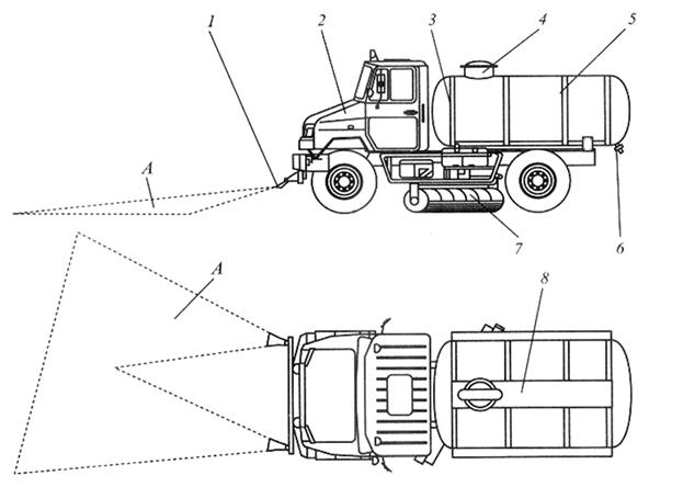 А – конфигурация моющей струи; 1 – моющие насадки с распределительным трубопроводом; 2 – базовая машина; 3 – цистерна; 4 – горловина цистерны; 5 – обечайки крепления цистерны к шасси; 6 – сливной патрубок; 7 – дополнительное щеточное оборудование; 8 – мостки для обслуживания цистерны.