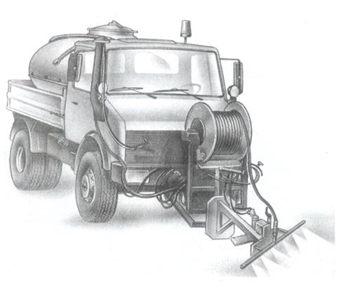 Существенным недостатком традиционной технологии мойки покрытия, при которой высокая кинетическая энергия моющей струи обеспечивается ее массой, считается высокий расход воды. Альтернативой может служить поливомоечное оборудование с моющей рампой, оснащенной большим числом направленных вниз сопел малого диаметра (рис. 2). Рампа расположена перед шасси невысоко над обрабатываемой поверхностью. Вода, подаваемая в расходный водовод под большим давлением, вырываясь из сопел с высокой скоростью, приобретает кинетическую энергию, необходимую для достижения моющего эффекта. Взвесь грязевых частиц в воде и фрагменты разрушенной грязевой корки принудительно удаляются с покрытия косоустановленным водосгонным ножом с эластичной кромкой.