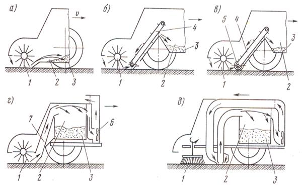 а - прямое забрасывание смета в бункер; б - механическая двухступенчатая подача смета; в - то же, трехступенчатая, г, д - пневматическое транспортирование смета: 1 - щетка, 2 - бункер для смета, 3 - смет, 4 – конвейер, 5 - шнек 6 – вентилятор, 7 - всасывающий рукав