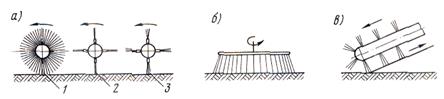 Цилиндрическими щетками выполняют основной объем работ по очистке твердых покрытий дорог, тротуаров, промплощадок и аэродромных полос. Они устанавливаются под углом к направлению движения машины между ее осями или перпендикулярно - за колесами задней оси. Первая схема применяется на универсальных машинах, которые в теплый сезон используются как подметально-уборочные и поливомоечные, а в холодное время года - как снегоуборочные и антигололедные.