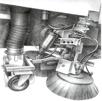 Подвеска щеточного оборудования этих машин позволяет выносить щетки за габариты машины и наклонять их под разными углами к горизонту, вплоть до вертикального. Водяные сопла закреплены на кронштейнах щетки таким образом, чтобы вода при любом положении щетки попадала на промываемый участок поверхности, увлажняя его и смывая грязь. Такие машины оборудуются щетками сразу нескольких типов, что позволяет обеспечить качественную очистку поверхности любой формы.