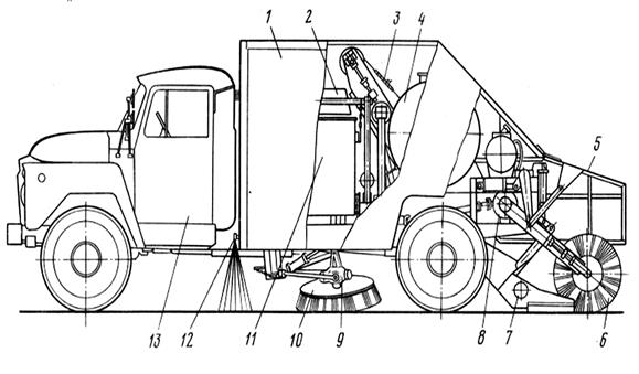 1 - кузов; 2 - распределитель смета: 3 - цепь со скребками, 4 - бак для воды; 5 - крышка кузова; 6 - цилиндрическая щетка; 7 - короб шнеков; 8 - конический редуктор, 9 - червячный редуктор с гидромотором; 10 - лотковая щетка. 11 - контейнер для смета; 12 - увлажнитель; 13 - базовое шасси