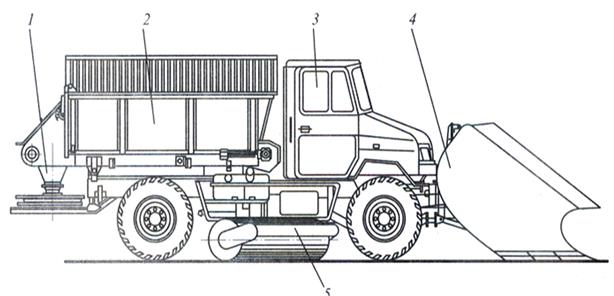 1 - распределитель сыпучих антигололедных материалов; 2 - бункер для сыпучих антигололедных материалов; 3 - кабина базового автомобиля; 4 - фронтальный косоустановленный снежный плуг переменной кривизны; 5 цилиндрическая косоустановленная подметальная щетка