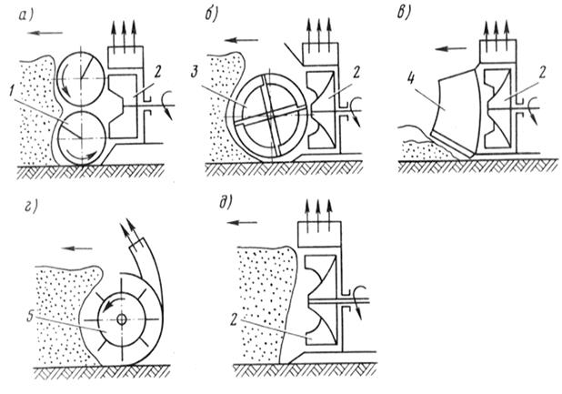 а - шнеко-роторный, б – фрезерно- роторный, в – плужно-роторный, г – фрезерный, д - роторный.