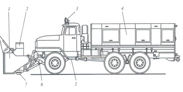 1 – лотковая щетка, 2 – гидросистема, 3 – базовое шасси, 4 – бункер для смета, 5 – отвал, 6 - цилиндрическая щетка, 7 - разбрасыватель