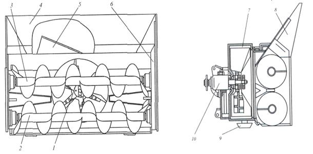 1 - нижний шнек, 2 - ротор снегометателя. 3 - верхний ротор, 4 - кожух шнековой камеры, 5 - направляющий аппарат снегометателя, 6 - кожух редуктора привода шнеков; 7- кожух снегометателя; 8 - козырек, отбрасывающий снег в зону работы шнеков; 9 - опорная лыжа; 10 - редуктор привода ротора