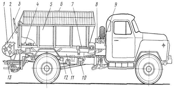 1 - редуктор привода конвейера 2 - бункер; 3 - рычаг шибера, 4 - скребковый конвейер, 5 - кузов. 6 – решетка, 7 – механизм натяжения конвейера, 8 - пульт управления, 9 – кронштейн запасного колеса, 10 - насос; 11 – надрамник, 12 - гидросистема; 13- разбрасывающий диск