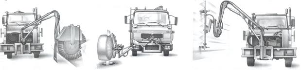 В зависимости от типа рабочего оборудования эти машины летом моют и подметают дорожные покрытия, зимой - сгребают и подметают свежевыпавший снег, посыпают дорожные покрытия минеральными и химическими материалами, перебрасывают снег в сторону роторными снегоочистителями. Базовым шасси служат автомобили, тракторное и специальное шасси.