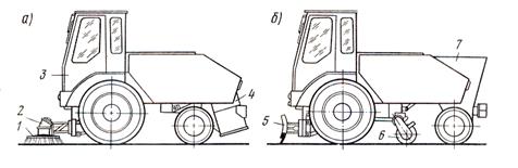 Тротуаро-уборочная машина К0-708 (рис. 15) на базе самоходного шасси Т-16М имеет две модификации: для работы летом (оснащена подметально-уборочным оборудованием) и зимой (оснащена плужно-щеточным и пескоразбрасывающим оборудованием).