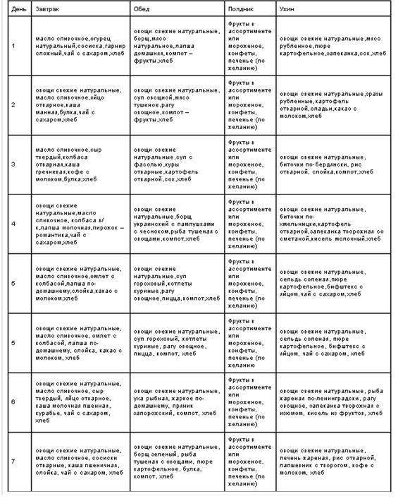 Питание в лагере четырехразовое, свежие овощи и фрукты в ассортименте - постоянно в рационе. Отведают ребята знаменитые украинский борщ и бердянскую уху, блюда из азовской рыбы. Меню представлено в Приложении А. [9]