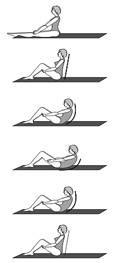 - Начинайте раскручиваться, опускайте поясницу позвонок за позвонком на пол. Не отрывайте ноги от пола. Кладите на пол среднюю часть спины, затем начинайте опускать шейные позвонки.