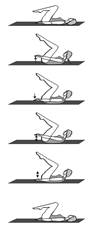 - Первым упражнением пилатес, которое стоит освоить является скручивание. Сядьте на коврик, вытяните ноги. Руки держите на бедрах. Согните колени как показано на рисунке.