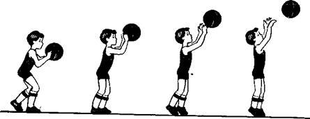При обучении ведению мяча целесообразны подготовительные упражнения: отбивание мяча обеими руками, отбивание правой и левой рукой на месте, ведение мяча на месте правой и левой рукой, ведение на месте поочередно, то правой, то левой рукой и т. д., которые позволяют освоить способ накладывания руки на мяч.