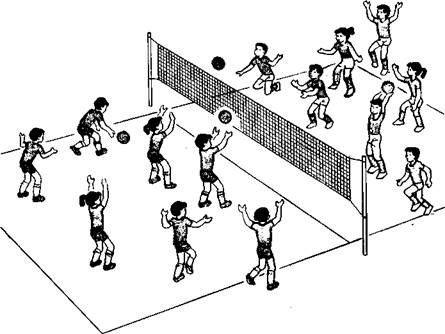 У кого меньше мячей. Дети образуют две равные команды. Каждая из них берет по нескольку мячей и располагается на своей половине площадки (площадка разделена сеткой, подвешенной на уровне 130—150 см).Дети обеих команд после сигнала воспитателя стараются перебросить свои мячи на площадку противника. Выигрывает команда, на площадке которой после второго свистка находится меньше мячей (рис.38).
