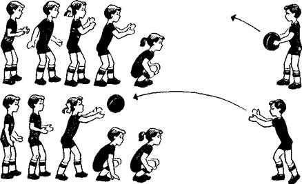 По сигналу воспитателя капитан передает мяч первому игроку колонны, который ловит его, передает обратно капитану и приседает (рис. 39). Капитан таким же образом передает мяч второму, затем — третьему и всем остальным игрокам. Каждый игрок после передачи мяча капитану приседает. Когда мяч передан капитану последним игроком, капитан поднимает мяч вверх над головой и вся команда быстро встает. Выигрывает та команда, которая раньше выполнила задание. Если игрок не поймал мяч, то он обязан за ним сбегать, вернуться на свое место и передать мяч капитану Перестрелка. В середине площадки проводят линию, делящую ее пополам. В 15—20 шагах от центра с двух сторон чертят еще по одной линии (плен).