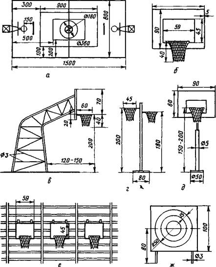 Корзины по размерамдолжны соответствовать стандартамвнутренний диаметр 45см, длина сетки 40см. Их подвешивают не ниже 180см и не выше 20см над уровнем площадки. Щиты размером 120X90 см делают из целого прочного дерева, поверхность окрашивают белым цветом, а края обводят линией шириной в 5см (рис41, б).Окантовку щитов желательно делать не черной краской, а яркой, веселой (красной, голубой). Стойку, к которой крепятся щиты, следует выносить на 1 — 1,5м от лицевой линиив целях предупреждения травм у детей. Виды стоек и типыкрепления корзины см. на рисунке 41(в — е). На рисунке 41(ж) показано устройство щита для метания мяча.)