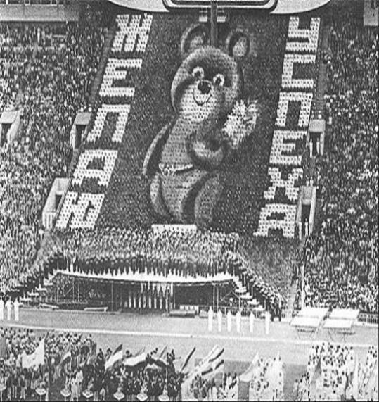 На экране художественного фона, выполненного из цветных щитов, возник образ Миши, символа Олимпиады-80. Появилась надпись "Доброго пути!", и из глаза медведя покатилась слеза. На арену стадиона вступил оркестр, выполнивший под звуки марша ряд перестроений. Затем на поле стадиона вышли спортсмены, которые синхронно выполнили упражнения, каждый из своего вида спорта.