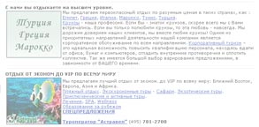 Такая реклама сравнительно недорогая, и ее могут использовать даже те фирмы, которые не имеют своего сайта. При размещении туров клиент получает пароль и может в любой момент самостоятельно редактировать и добавлять информацию о турах. Цена размещения на ведущих сайтах зависит от количества туров и начинается от $15 в месяц за пять туров. На сайгах TURIZM.ru и 100 Дорог один тур можно разместить бесплатно. Нужно учесть, что строчных предложений на сайтах довольно много, особенно по самым популярным направлениям.