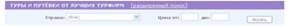 Туры. В разделе "Туры" туристическое агентство может разместить информацию о предлагаемых турпакетах. Указываются параметры: страна, тип поездки, ее продолжительность и цена. Возможно размещение ссылки на более подробную информацию о туре на сайте турагентства. Поле "Комментарий" вмещает свыше 3 тысяч знаков: таким образом, информация о туре на сайте Travel.ru предполагает не одну фразу, как это принято в печатной рекламе, а подробные сведения о программе и маршруте. Обновление информации о туре осуществляется агентством через персональный веб-интерфейс.