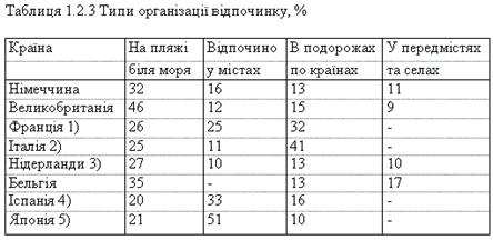 Прихильність до тих чи інших типів організації відпочинку досить суттєво відрізняється по країнах. Можна навіть говорити про національні вподобання типів відпочинку. Значна частина жителів Великобританії обере відпочинок на березі теплого моря - 46 %. Услід за британцями, але значно їм поступаючись, йдуть громадяни Бельгії (35 %) та Німеччини (32 %). Відпочинок у містах явно приваблює японців - 51 %, іспанців - 33 %, французів - 25 %. В подорожах країнами проводять свою відпустку жителі Італії - 41 % та Франції - 32 %.