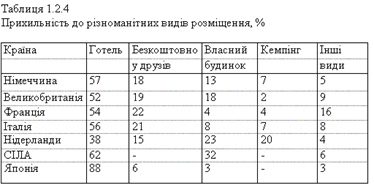 Приблизно рівну прихильність до розміщення в готелях зберігають жителі майже всіх країн - в межах 52-62 %. Однак є два винятки: 88 % японців обирають готель. У голландців готель як засіб розміщення займає більш скромне місце - лише 38 %. Зате вони є лідерами у виборі кемпінгу (20 %).
