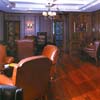 Главное место в этом мире сигар занимает расположенный серединно гарнитур итальянской мягкой мебели с натуральной кожаной обивкой цвета «бургунди», который необыкновенно приятен не ощупь и не удерживает сигарный запах. Большой круглый стол, за которым свободно могут разместиться пять человек, обрамлен справа парой кожаных кресел с пепельницами на подлокотниках, а слева – шикарным диваном. Преимущество такого расположения проявляется в том, что диван легко передвигается к стене слева на специально отведенное для него место. Эта многофункциональность выгодна, когда требуется обеспечить простор сигарной комнаты.