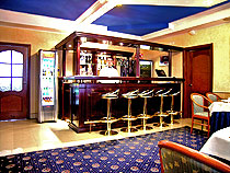 В курительном помещении гостиницы «Атлантида» удачным решением станет обустройство небольшой барной стойки, конструкционные особенности которой обеспечат удобство работы бармена и комфорт посетителям. Здесь гостям сигарной комнаты предоставляются различные сорта коньяков, виски и портвейн, а дополняет картину удачно подобранный винный ассортимент. Барная стойка и два барных стула занимают левый угол напротив окна, тем самым не отвлекая внимание от основной зоны комнаты.