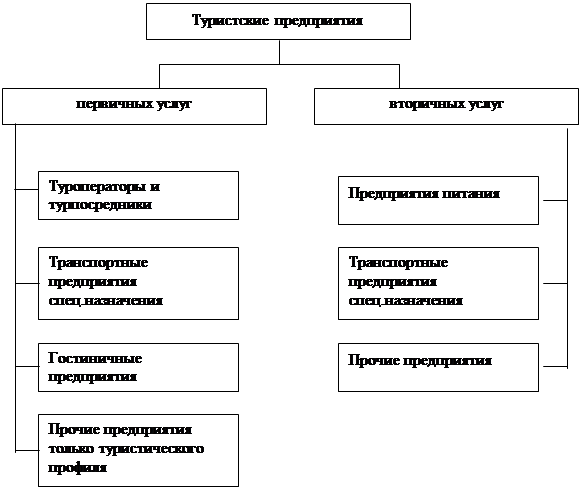 Туристские предприятия представляют собой третий важный компонент, создающий туристское предложение внутри подсистемы «объект туризма». В туристской отрасли функционируют различные туристские предприятия. Одни из них предоставляют клиентам исключительно туристские услуги, а для других туризм - это одно из нескольких второстепенных направлений их коммерческой деятельности. Предприятия, существующие только за счет туризма, называются туристскими предприятиями сферы первичных услуг, а предприятия, получающие доходы не только от туристской деятельности, - туристскими предприятиями сферы вторичных услуг. Таким образом, услуги первых предприятий служат исключительно туризму и составляют основу его существования, а услуги второй группы предприятий удовлетворяют лишь некоторую часть туристского спроса, так как туризм для них - лишь один из многих источников существования и их услугами пользуются не только туристы.