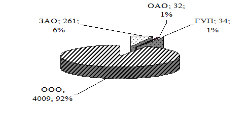 Согласно представленным данным, из 4336 турфирм, 4009 или 92% - Общества с ограниченной ответственностью, 6% турфирм являются закрытыми акционерными обществами (261 фирма) и по 1% турфирм, имеющих такие организационно-правовые формы как открытые акционерные общества и государственные унитарные предприятия.