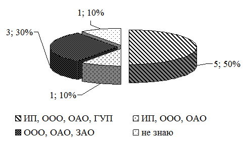 Согласно, данным диаграммы, 5 из одиннадцати руководителей назвали 4 из 11 организационно-правовых форм - ИП, ООО, ОАО и ГУП, трое руководителей перечислили такие формы как ООО, ОАО и ЗАО и считали, что турфирма не может быть другой организационно-правовой формы, кроме перечисленных; один руководитель указал на такие формы как ИП, ООО и ОАО.