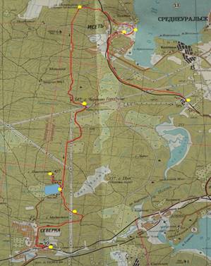 Основные пункты маршрута: ст. Гать (археологический памятник "Калмацкий Брод") – поселок Исеть (гранитные карьеры) – озеро Исетское – скалы Петра Гронского – скалы Чертово Городище – озеро Песчаное – гора Пшеничная – археологический памятник "Северская писаница" - поселок Северка (Северские скалы)