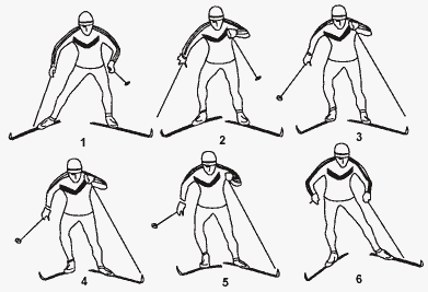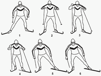 6) на коньковый ход без отталкивания руками переходят при достижении высокой скорости после одновременных ходов. Начинают переход из положения окончания отталкивания руками без промежуточных шагов. Для обратного перехода выполняют чаще всего один промежуточный шаг, во время которого руки занимают положение, характерное для начала одновременных двигательных действий в избранном ходе с отталкиванием руками.