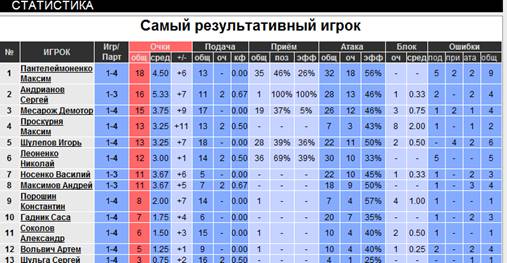 | Игрок 10 | качество | выиграл | проиграл | оставил в игре | выбил с приема | Total | ||||||